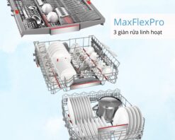 Máy Rửa Bát Độc Lập Bosch SMS8TCI01E được trang bị hệ thống giàn rửa Max Flex Pro với 3 giàn rửa. Giàn rửa trên cùng được sử dụng để lưu tữ các vật dụng nhỏ như dao, thìa, dĩa, đũa, muỗng, ly cà phê… Giàn rửa thứ 2 được thiết kế cho bát, đĩa và giàn rửa dưới cùng với dung tích lớn là không gian lý tưởng cho các vật dụng lớn như xoong, nồi…